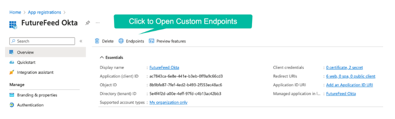 Once you've configured and saved your new FutureFeed app registration, you'll receive a set of new endpoints unique to that specific app registration. You can locate these within the "Overview" section of the registration. At the very top of this overview section, look for the "Endpoints" option and click on it.