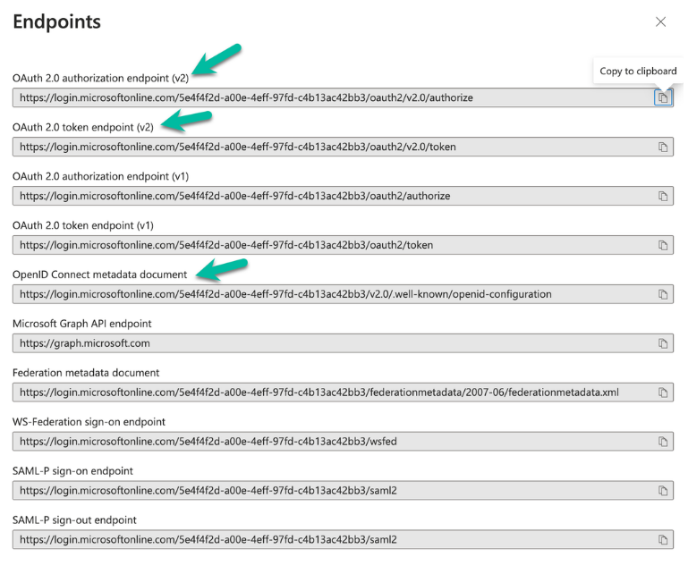 FutureFeed needs three endpoints from the list, OAuth 2.0 authorization endpoint (v2), OAuth 2.0 token endpoint (v2), and the OpenID Connect metadata document.