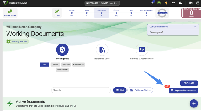 To help eliminate guesswork, expected document categories in FutureFeed are created by FutureFeed’s Compliance and Education Department. If you work with a service provider, they may also define or supplement categories based on their experience and methodology. These expectations are not mandatory, but they reflect what auditors commonly ask for and help you confirm that your foundational documentation is in place.